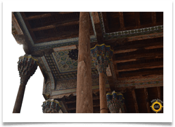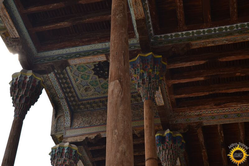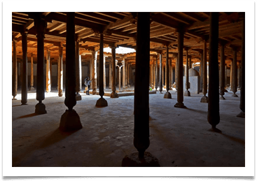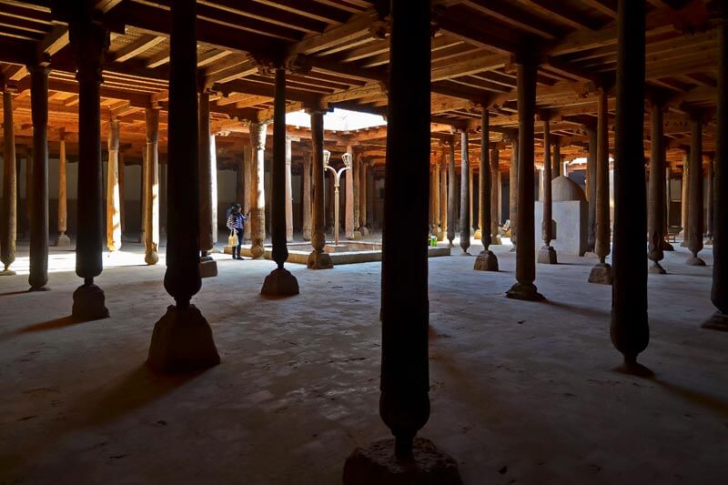 ヒヴァイチャン・カラの砦で金曜日のモスク。アラブの地理学者にムカッダシアによるとジュマモスクは歴史は10世紀にまでさかのぼります。大ホールの天井は213木製の柱でサポートされています。21本柱はX-XIIの世紀を指しアラビア語の碑文があります。ヒヴァタイプに花柄や花柄を持柱はXVIII-