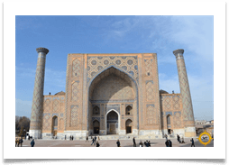 早めの朝食、鉄道駅へ移動(7時00分)。特急「Afrosiab」(XXキロ/2.10時間)によってサマルカンドに出発。サマルカンドに到着(午前10時10分)、サマルカンドでのガイドツアー:レギスタン広場(Medrase